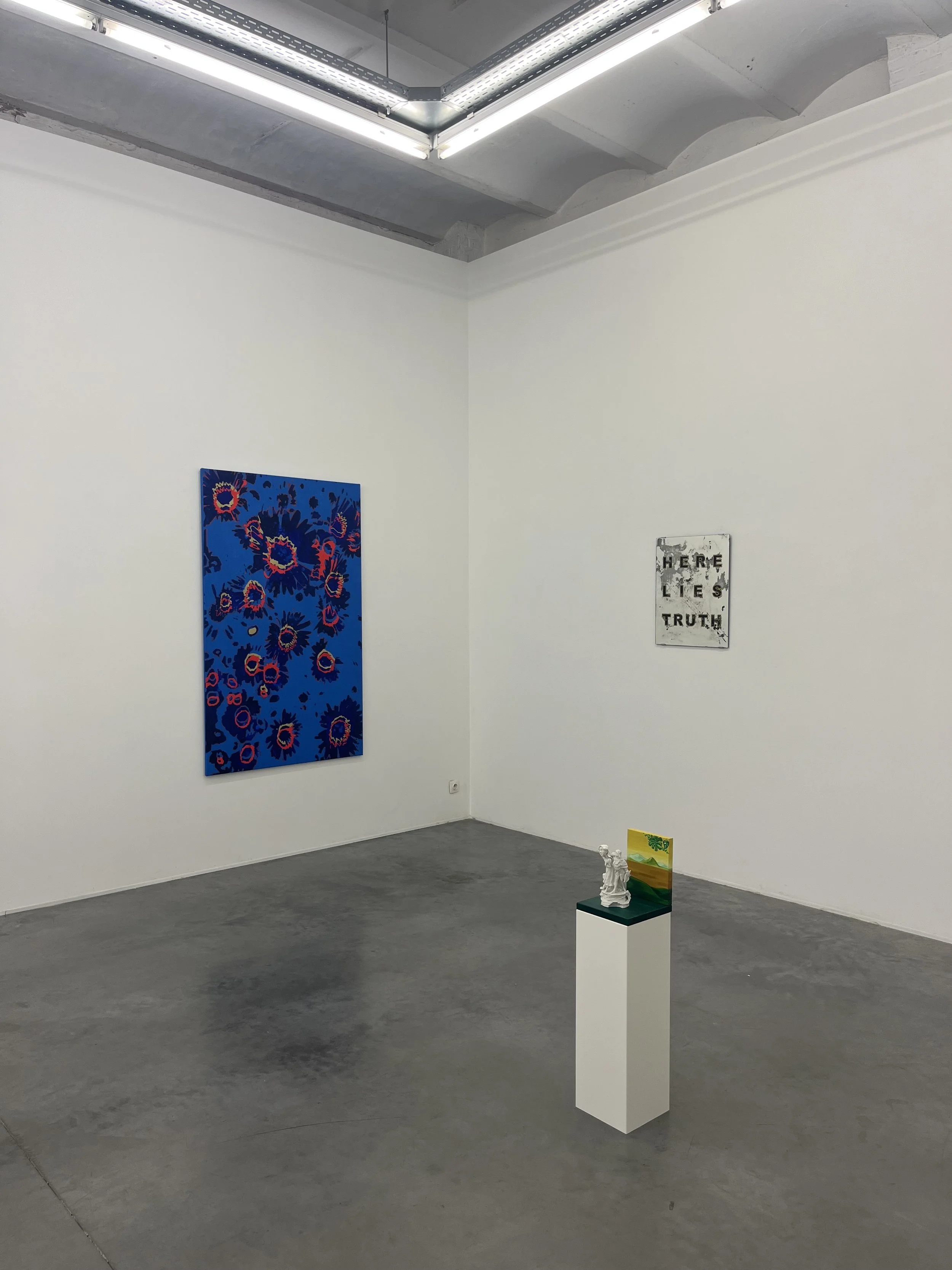 As an additional layer to the exhibition, Cop curated a complimentary presentation titled [Guest], selecting work from the oeuvre of internationally acclaimed artist Kendell Geers. Although though Geers’ practice flirts more with Minimal and Conceptual Art, the two artists share a critical engagement with the underlying structures of art history and power. Where Cop’s work is dominated by the unsettling presence of the grin, Geers subtly integrates dark humor and a sharp linguistic edge into his visual strategies. The work ‘Here Lies Truth’ is a perfect example. See what he did there?