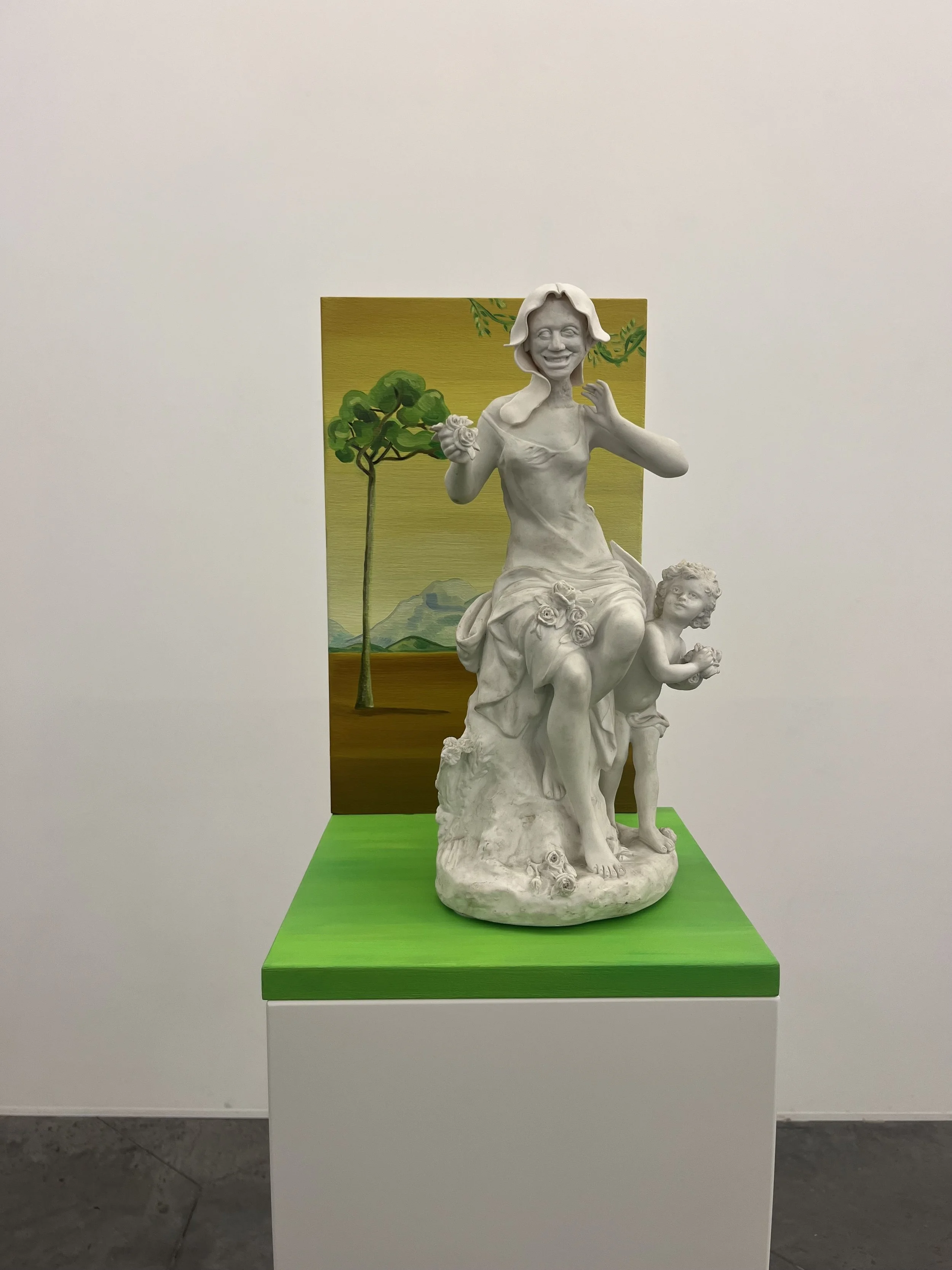 ‘Grace Grit Grin’, the third solo exhibition of Ilke Cop at Tatjana Pieters Gallery, deepens the artist’s ongoing exploration of how the female body is presented and judged through art and society. This time, Cop expands her practice by introducing sculptures to intensify the questions of embodiment and perception. Central to this series is her reworking of damaged porcelain figurines, objects historically associated with idealized femininity and archaic power structures. Cop reimagined the figurines by adding exaggerated, almost grotesque smiles. Across her sculptures and paintings, the bared teeth smile or ‘the grin’ is a persistent visual. Simultaneously confrontational and unsettling, Cop prompts the viewers to engage with the grace, resistance and discomfort that permeate her work.