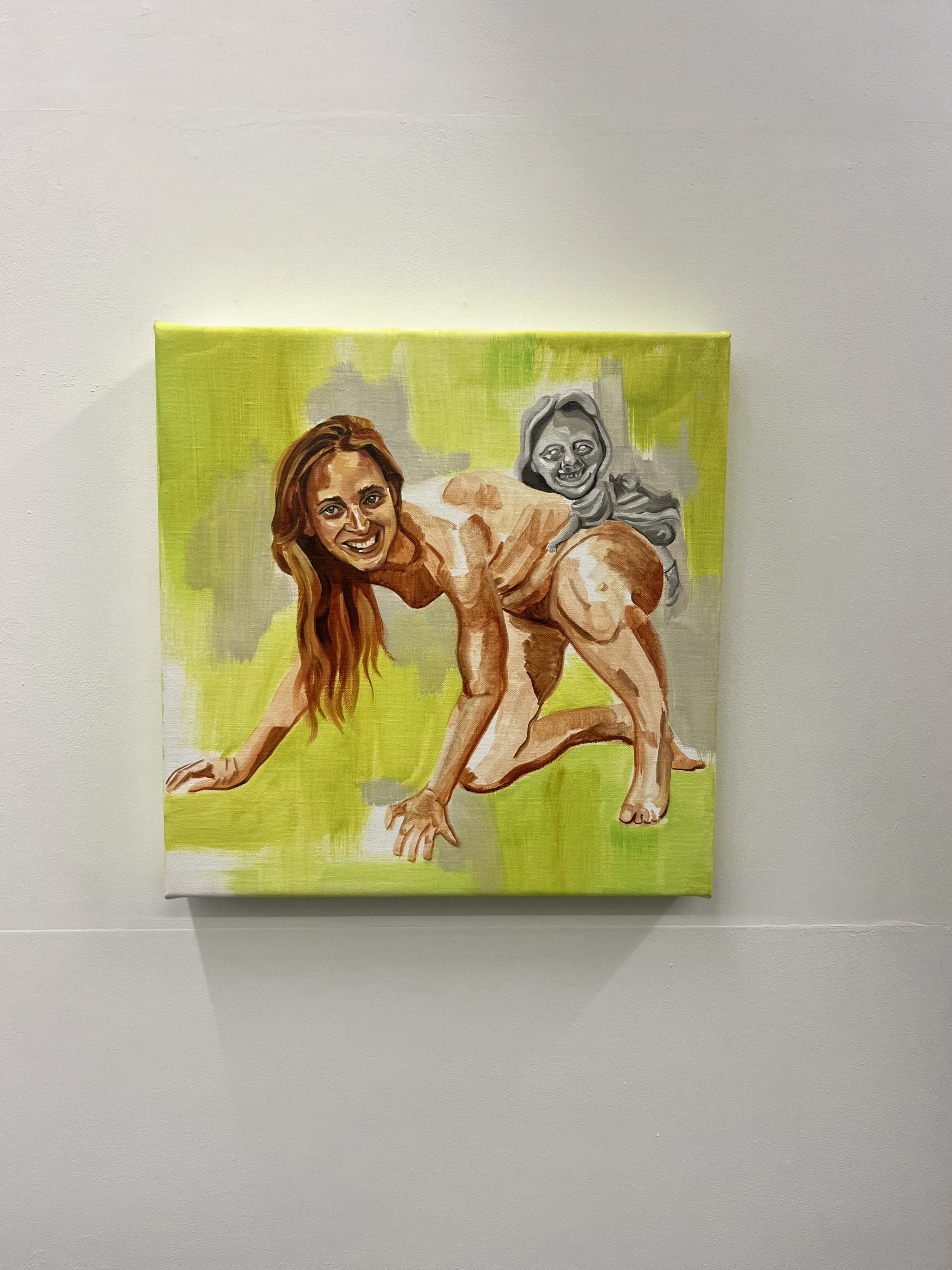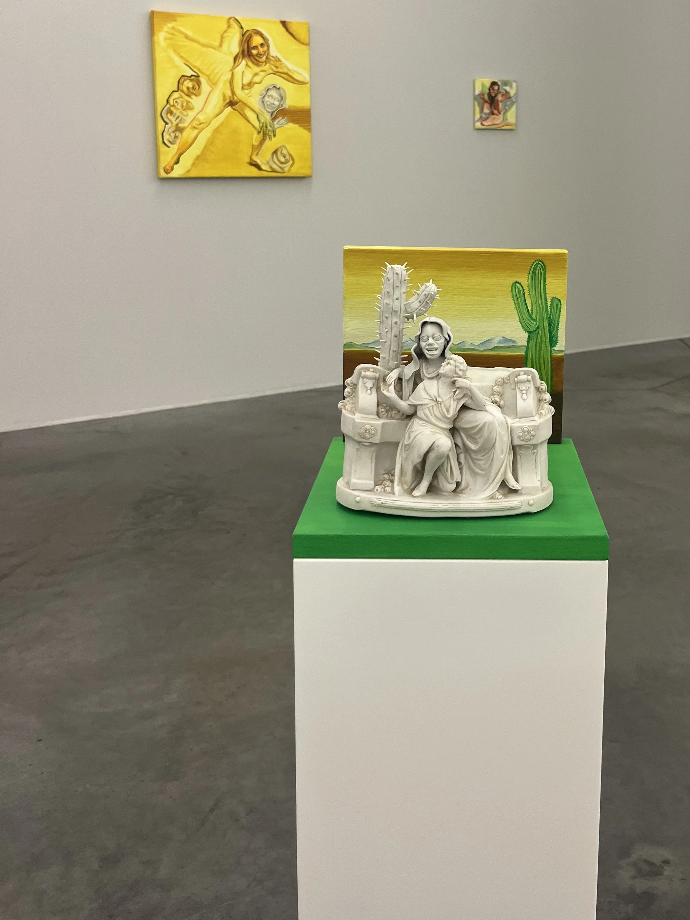 These so-called “art monsters” are the protagonists of the exhibition, appearing as both sculptural figures and recurring characters within Cop’s paintings. While her practice continues to draw on her own likeness as a starting point for representing the female body, this series marks a shift in her method. She closely studies the postures of the porcelain figurines, restages them through photographs of herself, and then translates this exploration onto canvas. The resulting images are not straightforward self-portraits, but rather investigations of how the female body has traditionally been framed and controlled. The nudity in her work is not meant to be erotic; instead, it functions as a shared, universal language that connects viewer and subject. In a time when the depiction of the female body has become increasingly politicized, Cop invites us to look beyond established boundaries.