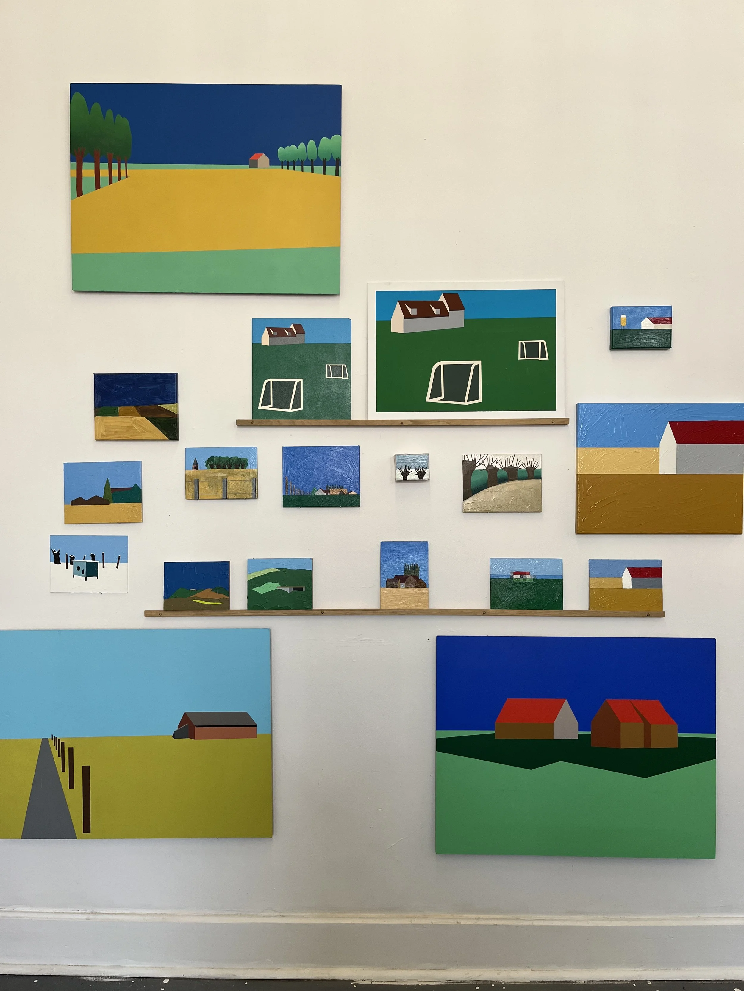 De modulaire installaties van Conrad Willems worden gekenmerkt door geometrie en herhaling. Willems maakt een betonnen of natuurstenen versie van de geometrische vormen uit een klassieke blokkendoos. Vervolgens stapelt hij deze tot een kunstwerk. Sculpturen en assemblages uit alledaagse objecten zijn de kern van het werk van Pieter De Clercq. De gebruiksvoorwerpen krijgen een nieuwe bestemming als kunstwerk die op zichzelf kunnen bestaan of deel uitmaken van een grotere showroominstallatie. In de kleurrijke en grafisch ogende schilderijen van Jana Vasiljević komt haar achtergrond als illustrator en stripmaker terug. Ze bracht de lockdown door in een landelijk Oost-Vlaams dorp wat resulteerde in haar ode aan het platteland. Hier worden weilanden en graanvelden respectievelijk groene en gele vlakken en krijgen de typische landelijke boerderijen en huizen een meer abstracte vorm.