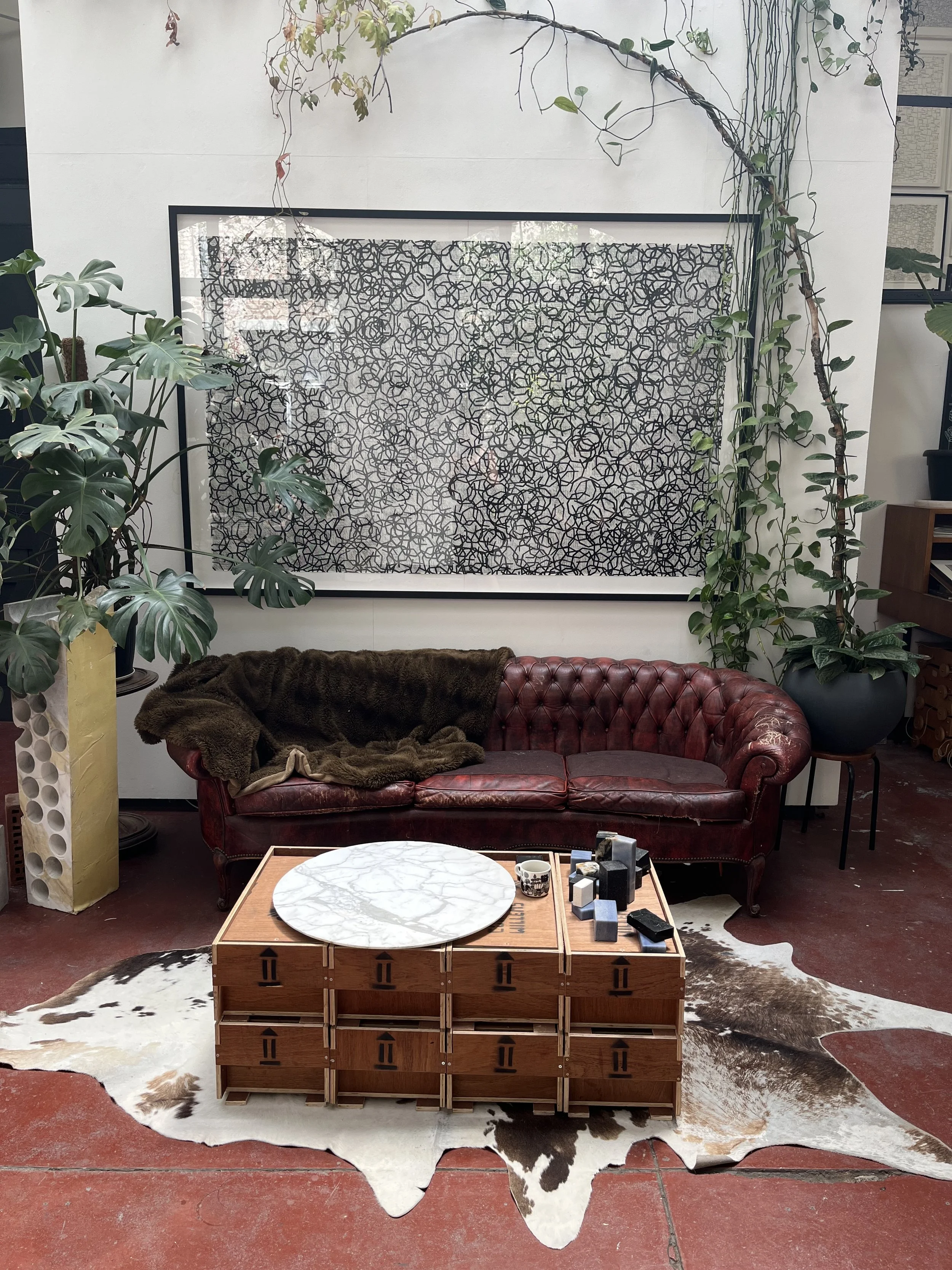 Jonas Vanderbeke laat kunstgeschiedenis versmelten met hedendaagse beelden. Wederkerige elementen in zijn schilderijen zijn symbolen van vergankelijkheid, bloemen, helden en dieren. Deze worden uit hun verwachte context gehaald en in een nieuw, vaak uitbundig kleurrijk geheel geplaatst. Leuk weetje, door de kleine atelierruimte trekt Jonas zijn schilderijen vaak uit elkaar door er meerluiken van te maken. Marijn Dionys valt niet onder één noemer thuis te brengen. Met een opleiding als meubelontwerper en interieurvormgever maakt hij meubelen, voornamelijk met hout als basismateriaal. Mijn favoriet hierbij is een elegante platenkast waar een platenspeler verwerkt is in een aluminiumplaat in het houten blad, er ruimte is voor een versterker en het geheel gedragen wordt door een blok om lp’s in op te bergen. Verder illustreert Dionys – meestal in opdracht – en maakt hij vrij werk. Hierbij gebruikt hij atypische materialen als lego en X-ray. Bij zijn reeks taxidermie prikt hij naalden in een kader die hierdoor de vorm krijgen van een vlinder of kever.