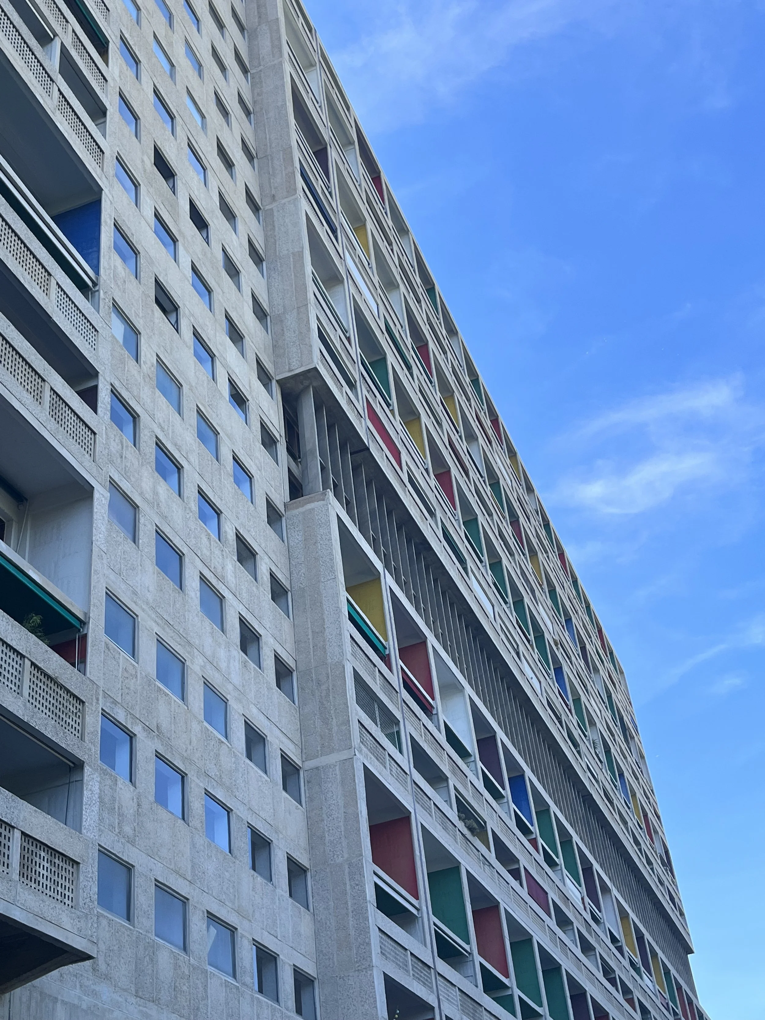 The impressive building, 165 meters long and 56 meters high, is supported by monumental concrete pillars. Unlike other projects by Le Corbusier, it lacks his characteristic sleek white façade. The complex is entirely built from reinforced concrete. The façades consist of a grid of recessed windows and balconies with colorful side walls. The dimensions of ‘Cité Radieuse’ are based on Le Corbusier's own modular system, which is derived from the proportions of the human body.