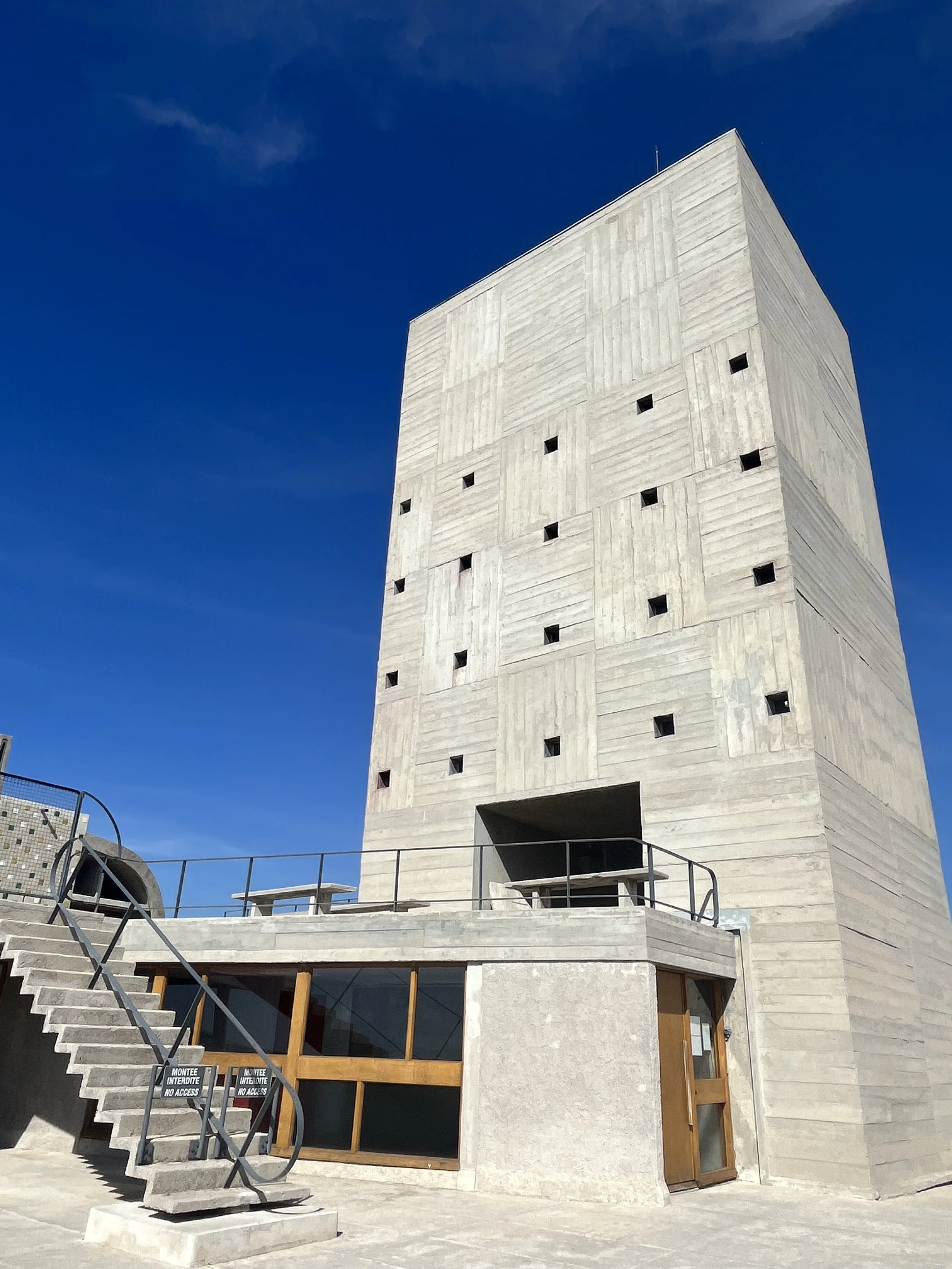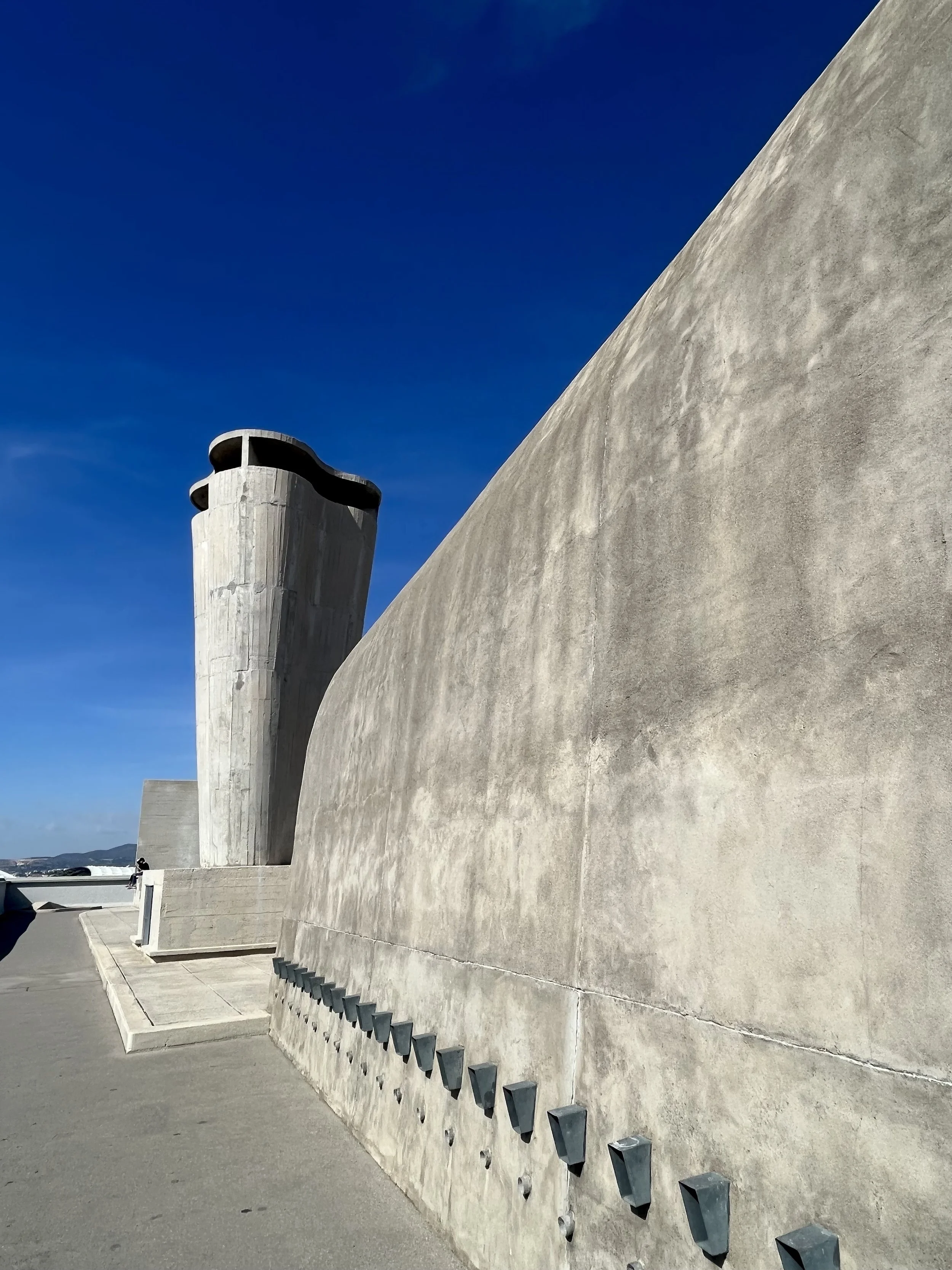 The roof is designed as a public space, featuring a daycare center, an athletics track, and a swimming pool. From the roof, you are treated to a magnificent view of the sea, the surrounding mountains, and the buildings of the French city itself. However, for me, it's not just the view that is impressive—the structures on the roof are equally striking. There are raw concrete chimneys with a sculptural appearance, the curved gymnasium finished with mosaic details, various staircase constructions... One is left in awe of the countless elements on display.