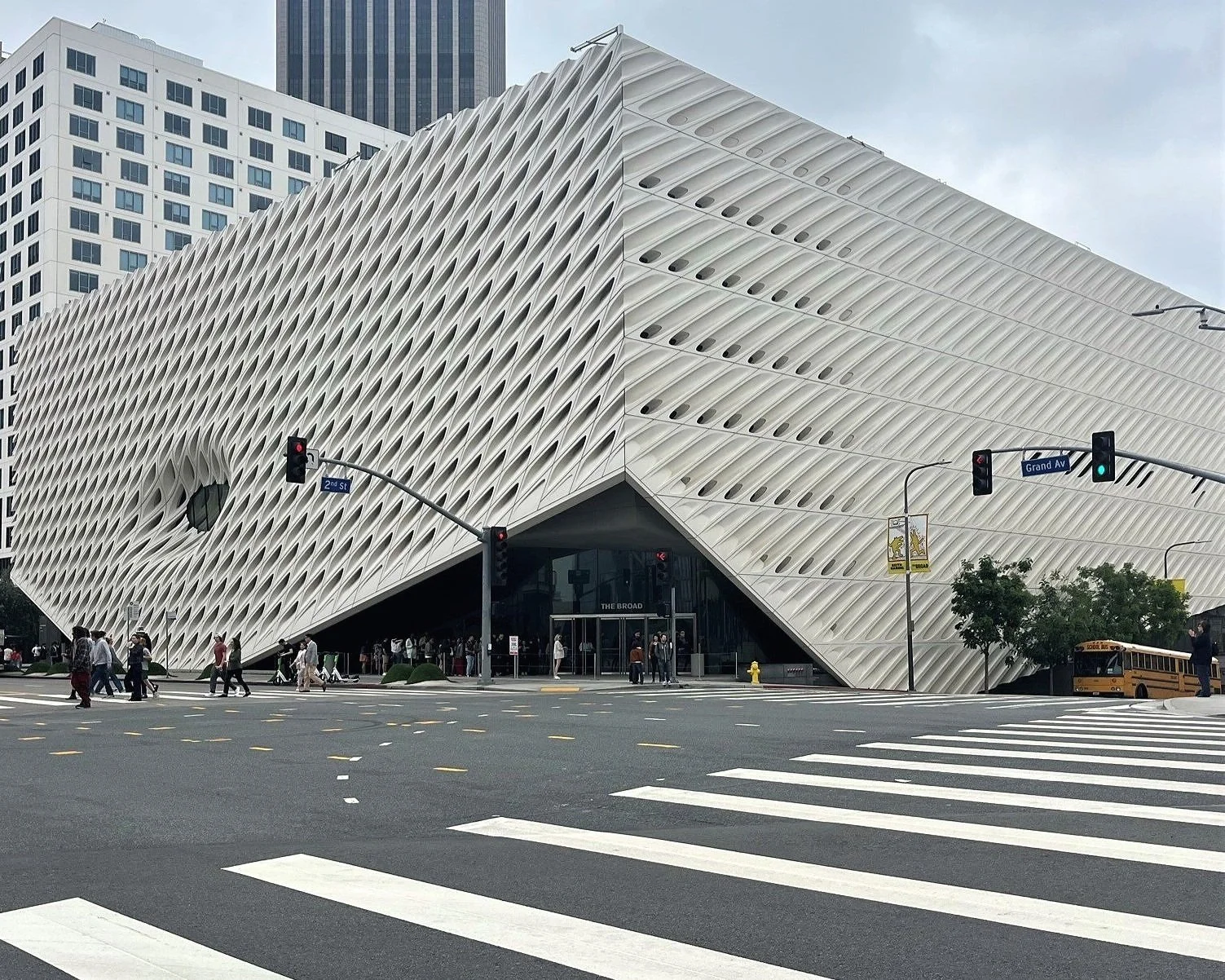 Los Angeles heeft zijn levendige buurten met hippe bars en restaurants, creatieve broeiplaatsen, skaters en streetart. Je hebt luxueuze wijken zoals Beverly Hills en Bel Air met weeldigere landgoederen waar filmsterren zich graag lijken te vestigen. Minstens evenveel gebieden in LA kampen echter met verval, drugsproblematiek en criminaliteit. Straten waar je niet zomaar wil flaneren. Zo was Bunker Hill een elegante wijk met Victoriaanse huizen totdat verloedering niets meer overliet van de oorspronkelijke charme. Een recent opwaarderingsproject transformeerde het stadsdeel tot een zakenwijk met allures van een kunstdistrict. De concentratie aan (kunst)instituten verpakt als een architecturaal snoepje aan Grand Avenue en omliggende straten is indrukwekkend. Zo heeft The Broad volgende kleppers als buren: de golvende en glimmende Disney Concert Hall ontworpen door Frank Gehry, het met rode zandstenen beklede Museum of Contemporary Art (MoCA) van de hand van Arata Isozaki en een sculpturale school voor beeldende en podiumkunsten ontworpen door Coop Himmelb(l)au. Een museum oprichten dat kan aansluiten bij dit indrukwekkende rijtje stelde Eli en Edythe Broad voor een uitdaging. Dankzij het ontwerp van architectenbureau Diller Scofidio + Renfro in samenwerking met Gensler werd een gebouw neergezet dat boeiend genoeg is om de aandacht vast te houden.